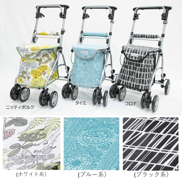 北欧デザイン<フィンレイソン>を使用した人気のシルバーカー。お買い物時のご使用や、疲れた際に椅子として腰掛けるなど便利な機能で充実、お出掛けを快適にサポートします。